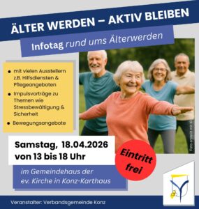 Unter dem Titel “Gesund und vital bleiben … auch im Kopf!” findet am Mittwoch, 18. März von 10 – 11 Uhr ein NeuroKinetik®-Gedächtnistraining für Seniorinnen und Senioren ab 75 Jahren in den Räumlichkeiten des Pflegestützpunktes Konz, Karthäuser Straße 157 statt. NeuroKinetik® ist ein ganzheitliches Gedächtnistraining, das darauf abzielt, die geistige und motorische Leistungsfähigkeit bis ins hohe Alter zu erhalten. Bewegungseinheiten aus der NeuroKinetik® bringen nicht nur Abwechslung, sondern verbessern auch die körperliche Wahrnehmungsfähigkeit, beispielsweise in Bezug auf geistige Flexibilität und Sturzprophylaxe.