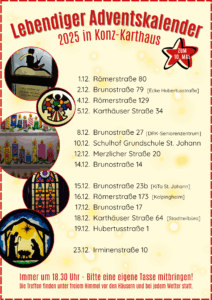 Es ist Jubiläumsjahr und in diesem besonderen Jahr wird es in unserem Stadtteil einen lebendigen Adventskalender mit 14 Fenstern geben. Es wird sich lohnen, an den genannten Abenden um 18.30 Uhr vorbeizukommen und den Geschichten, Liedern und Impulsen zu lauschen und natürlich die erleuchteten Fenster zu bestaunen.