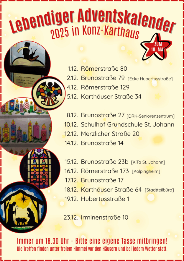 Die Treffen finden um 18:30 Uhr vor den Häusern unter freiem Himmel statt. Für das anschließende gemütliche Beisammensein bitte eine eigene Tasse für Tee, Punsch oder Glühwein mitbringen.